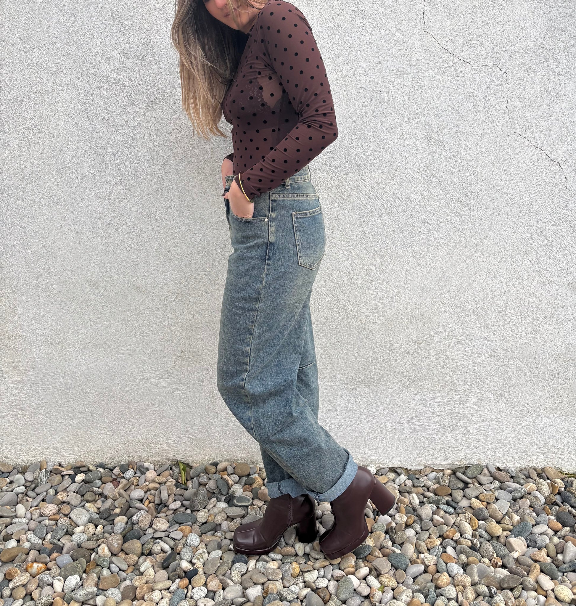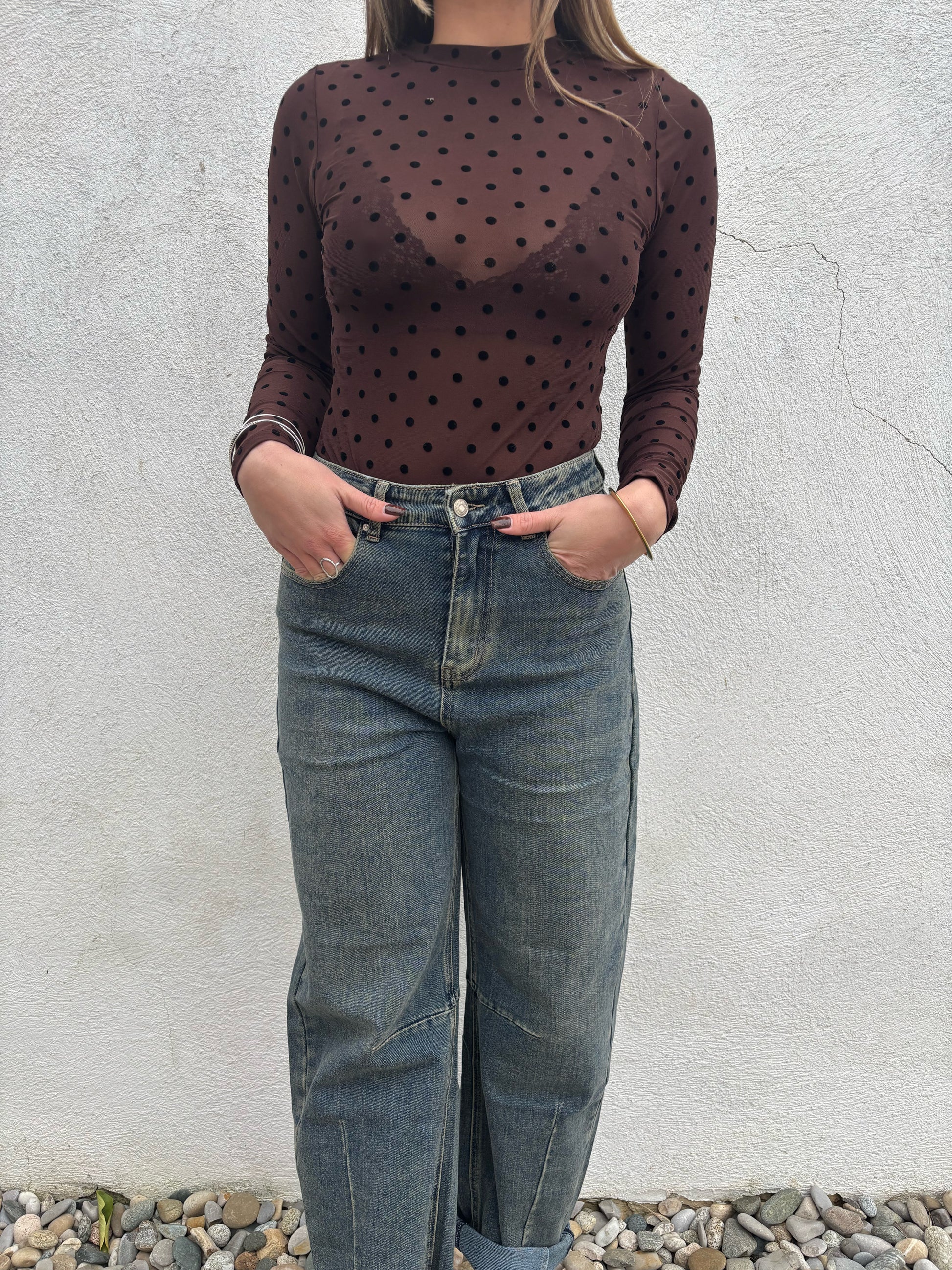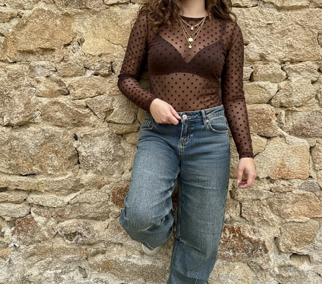 Ce body en mesh chocolat à pois est la pièce parfaite pour sublimer vos tenues avec sophistication. Sa transparence délicate et son imprimé à pois élégant créent un effet glamour irrésistible, tout en restant chic et raffiné.
