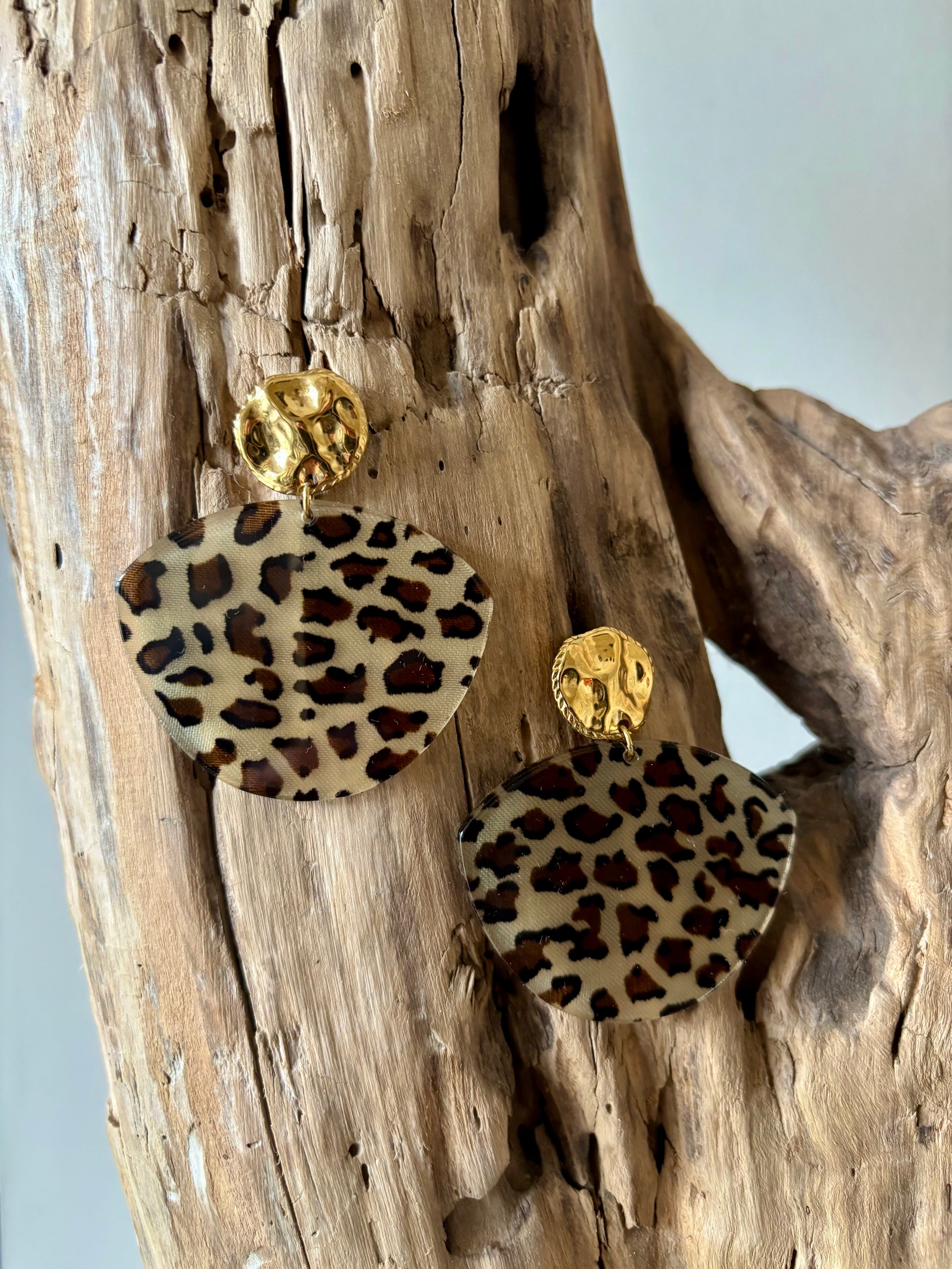 Boucles d'oreilles pendantes au motif léopard, rehaussées d'une puce dorée martelée. L'alliance parfaite entre l'esprit sauvage et l'élégance intemporelle. Légères et confortables, elles apportent une touche audacieuse à toutes vos tenues.