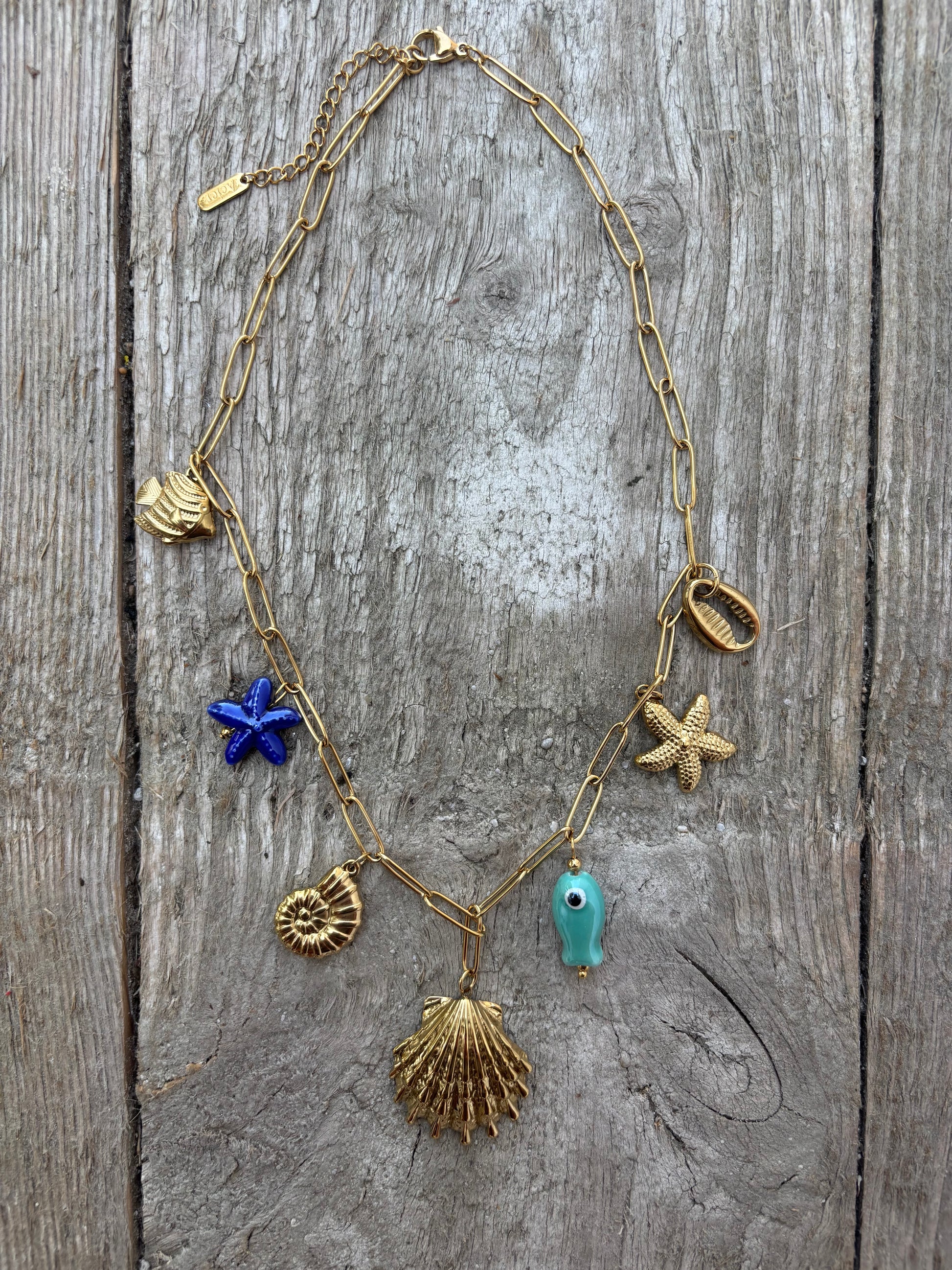 Laissez-vous emporter par les vagues avec Sirena, un collier doré aux accents marins. Monté sur une chaîne fine en acier inoxydable doré, il dévoile de délicates breloques inspirées de l’océan : coquillages, petits poissons et étoiles de mer.