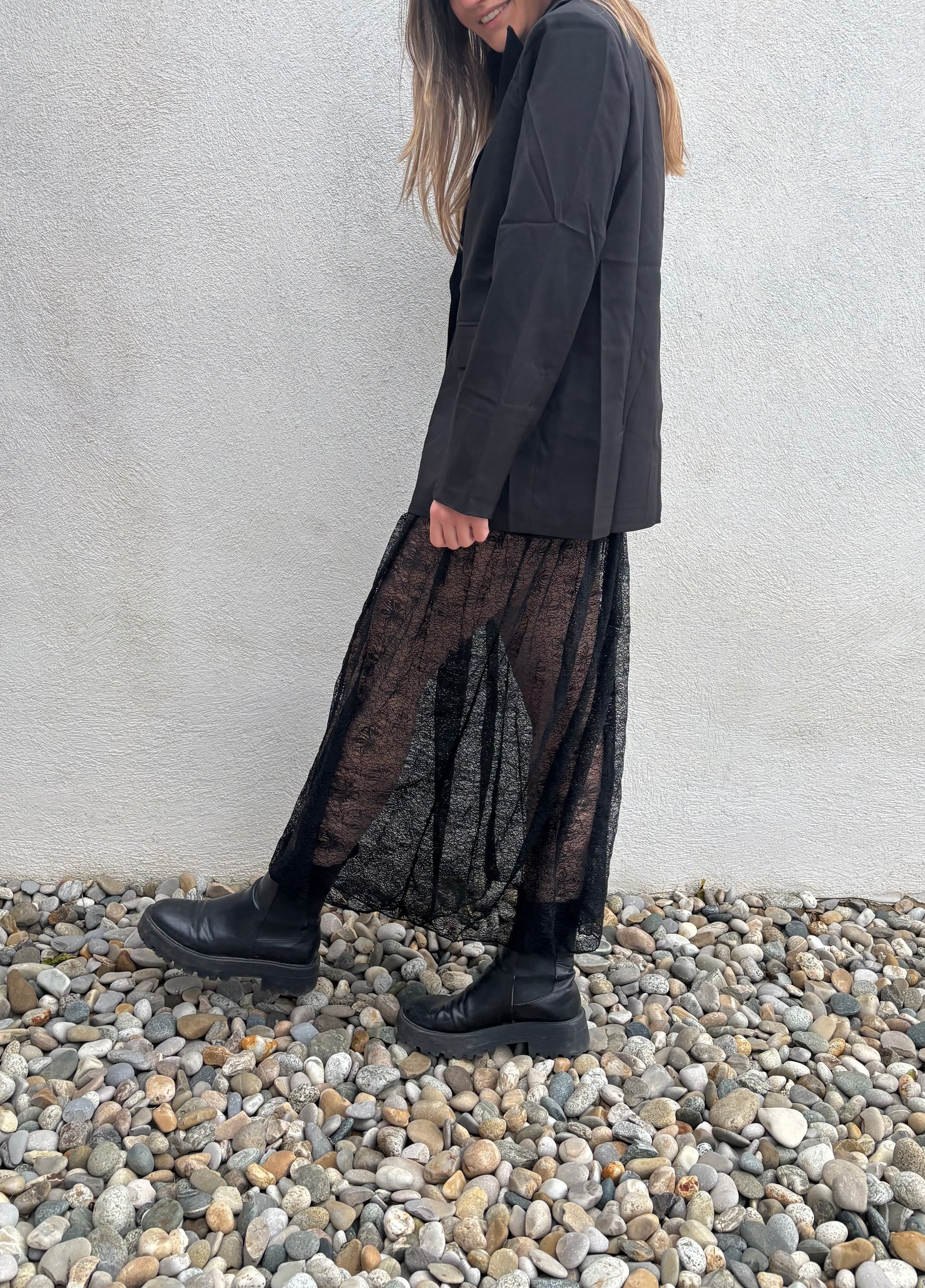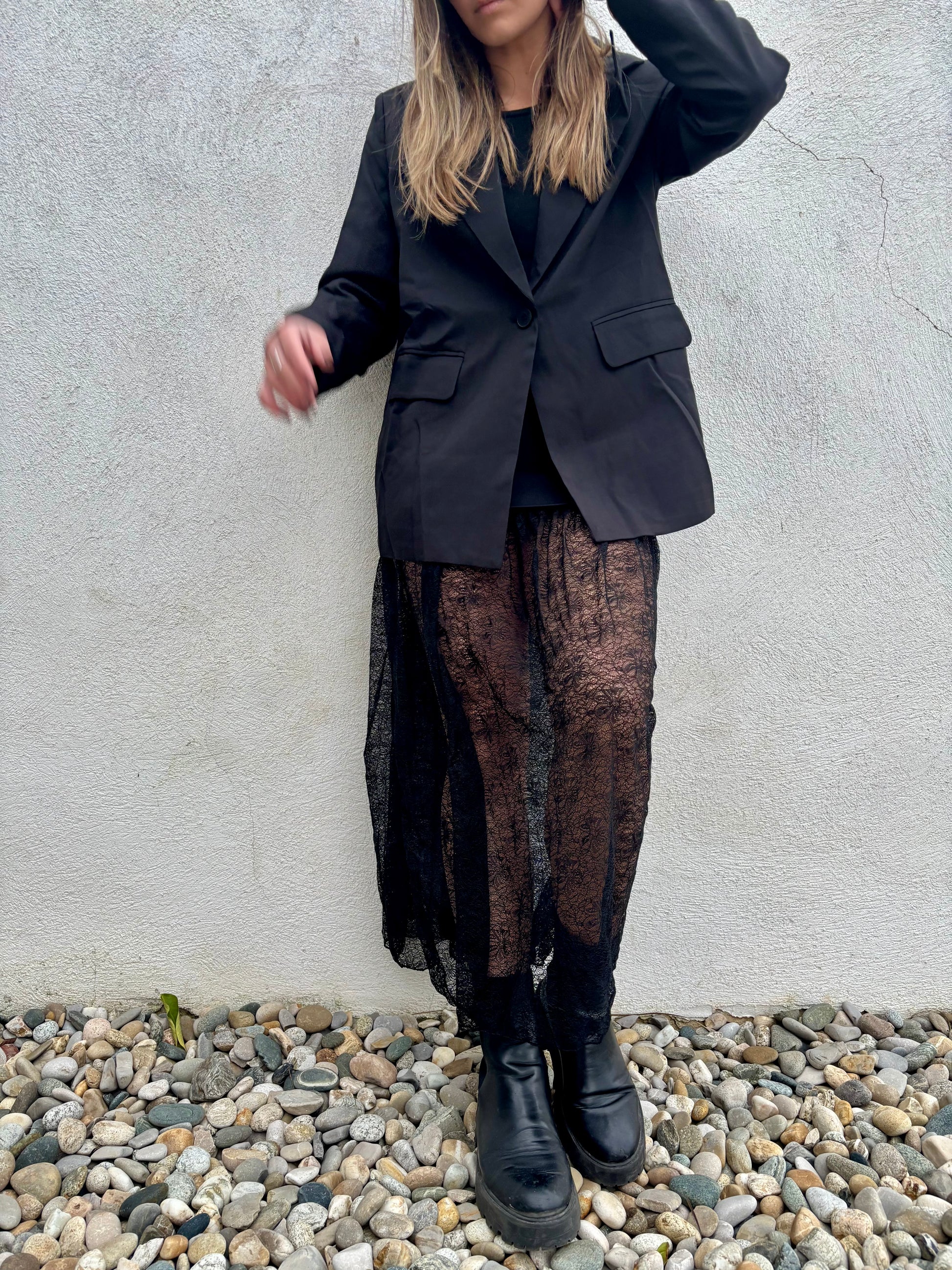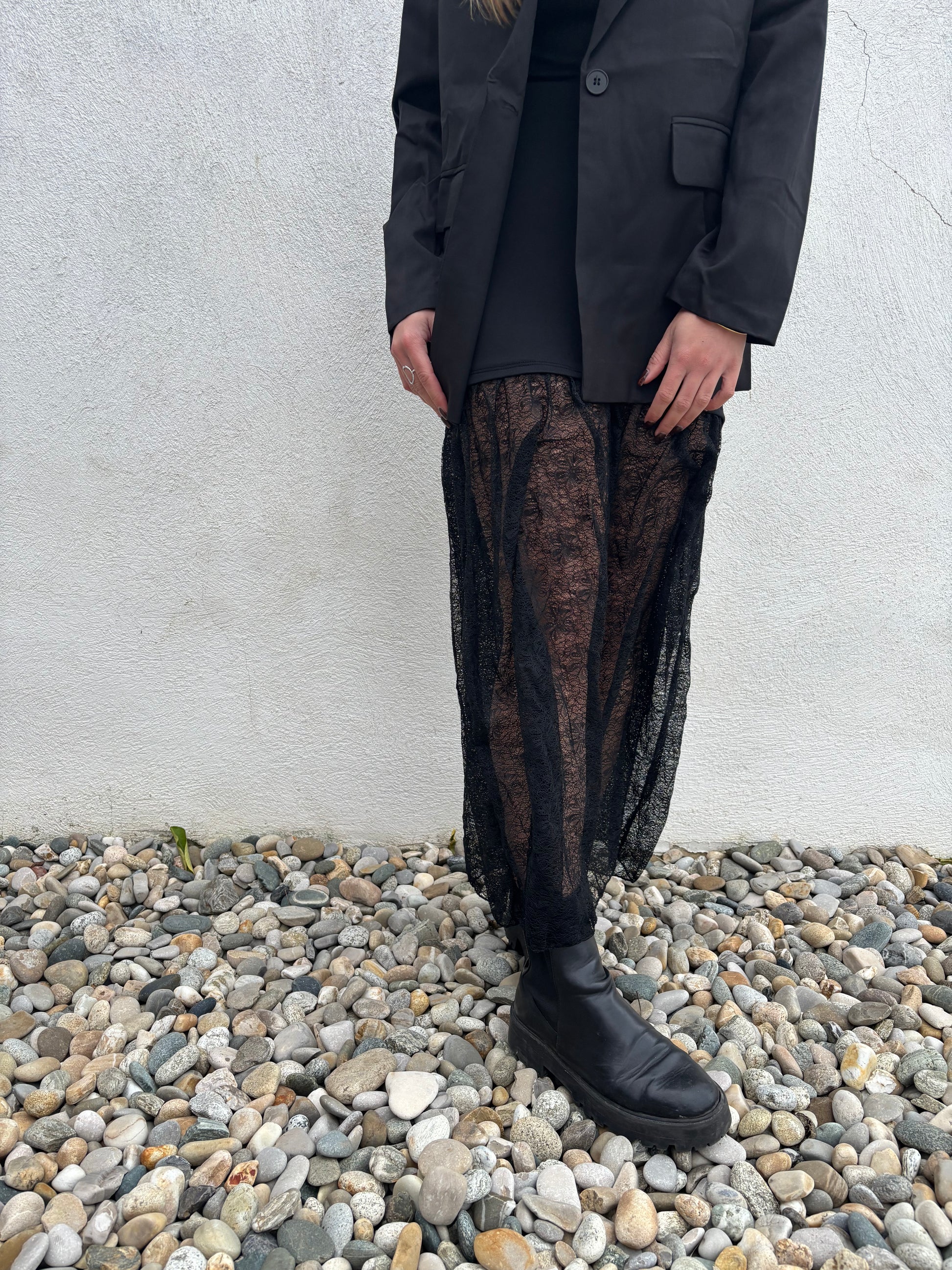 Jupe fluide en tissu stretch, dotée d'une taille élastiquée. Finition en dentelle légère pour un effet romantique. Idéale pour les occasions décontractées ou habillées.
