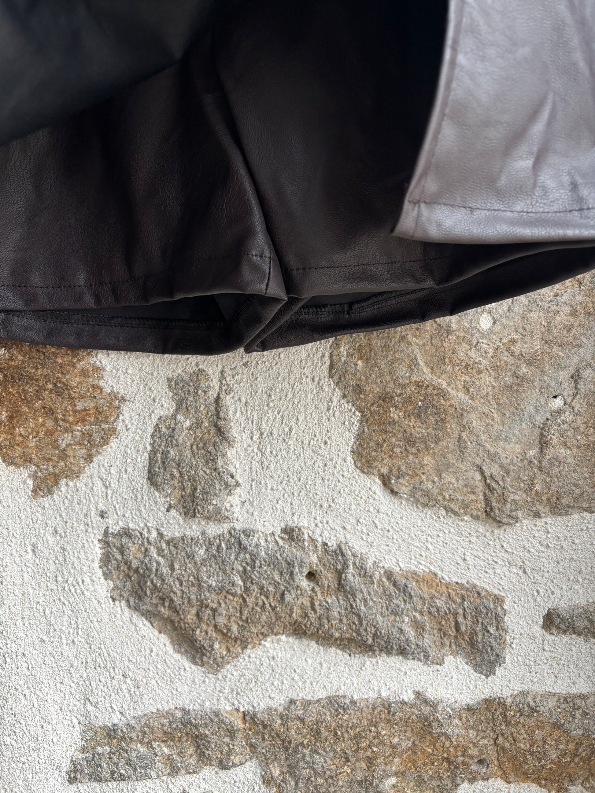 Jupe skort Léonie en simili cuir avec taille élastique, offrant un style chic et moderne. Idéale pour un look casual ou habillé, elle se porte facilement avec des bottes ou des talons.
