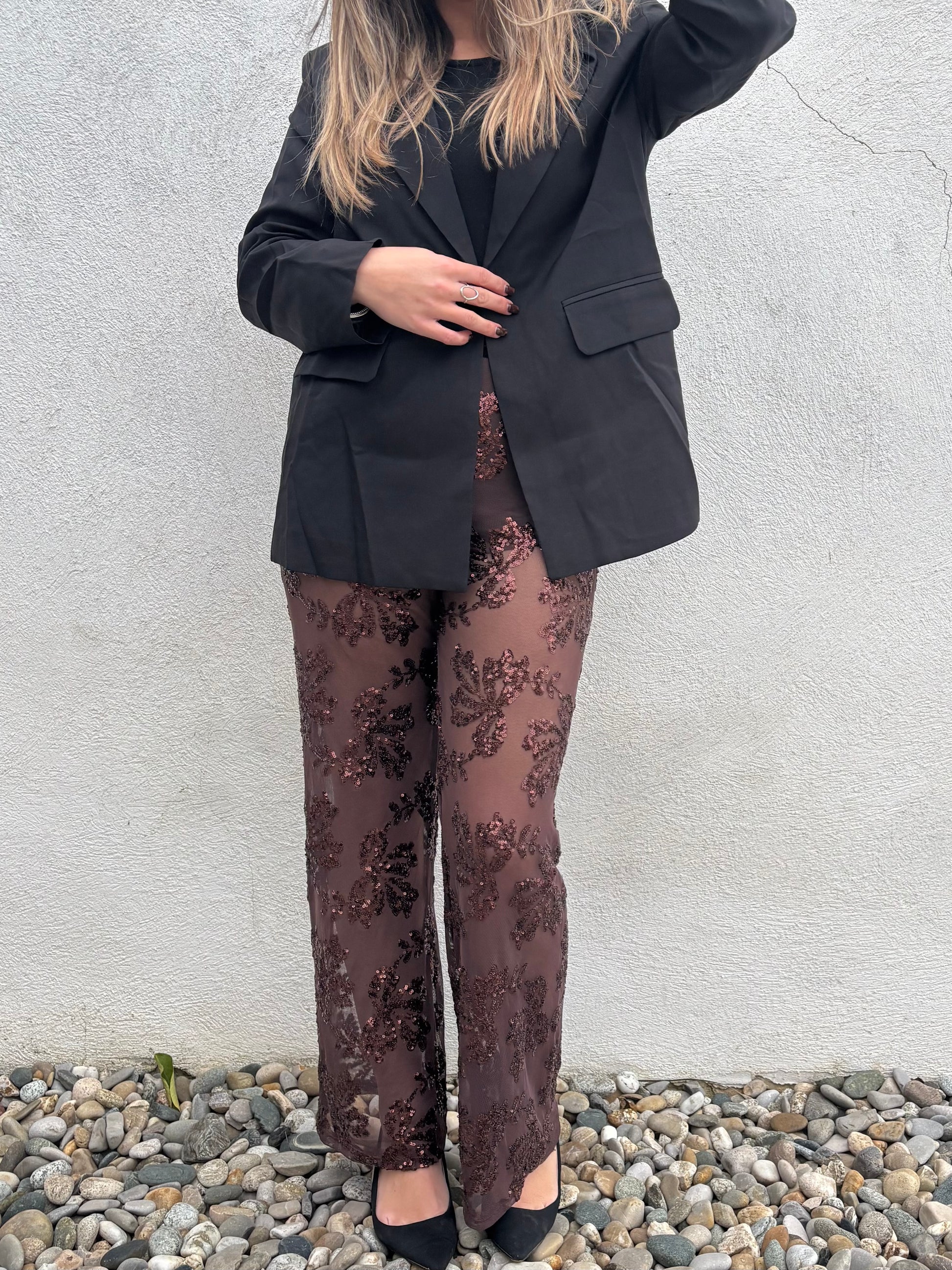 Ce pantalon ample sublime la silhouette féminine avec son élégante broderie florale en sequins choco. Sa transparence raffinée est sublimée par une doublure courte en viscose qui assure un confort optimal tout en préservant le mystère.