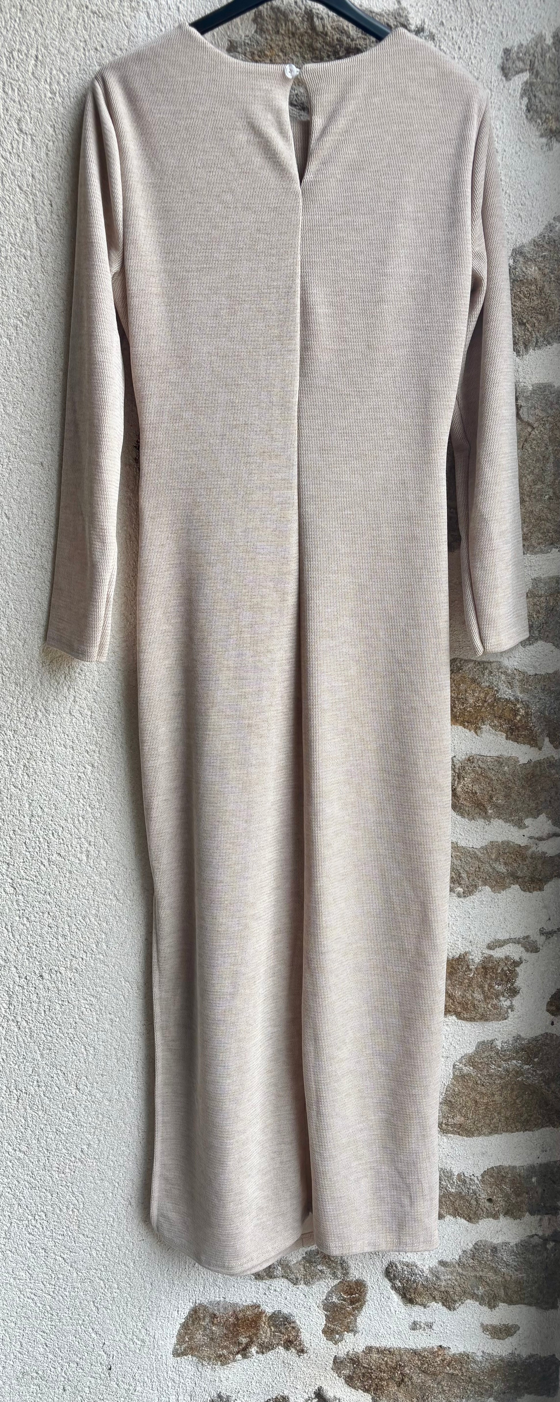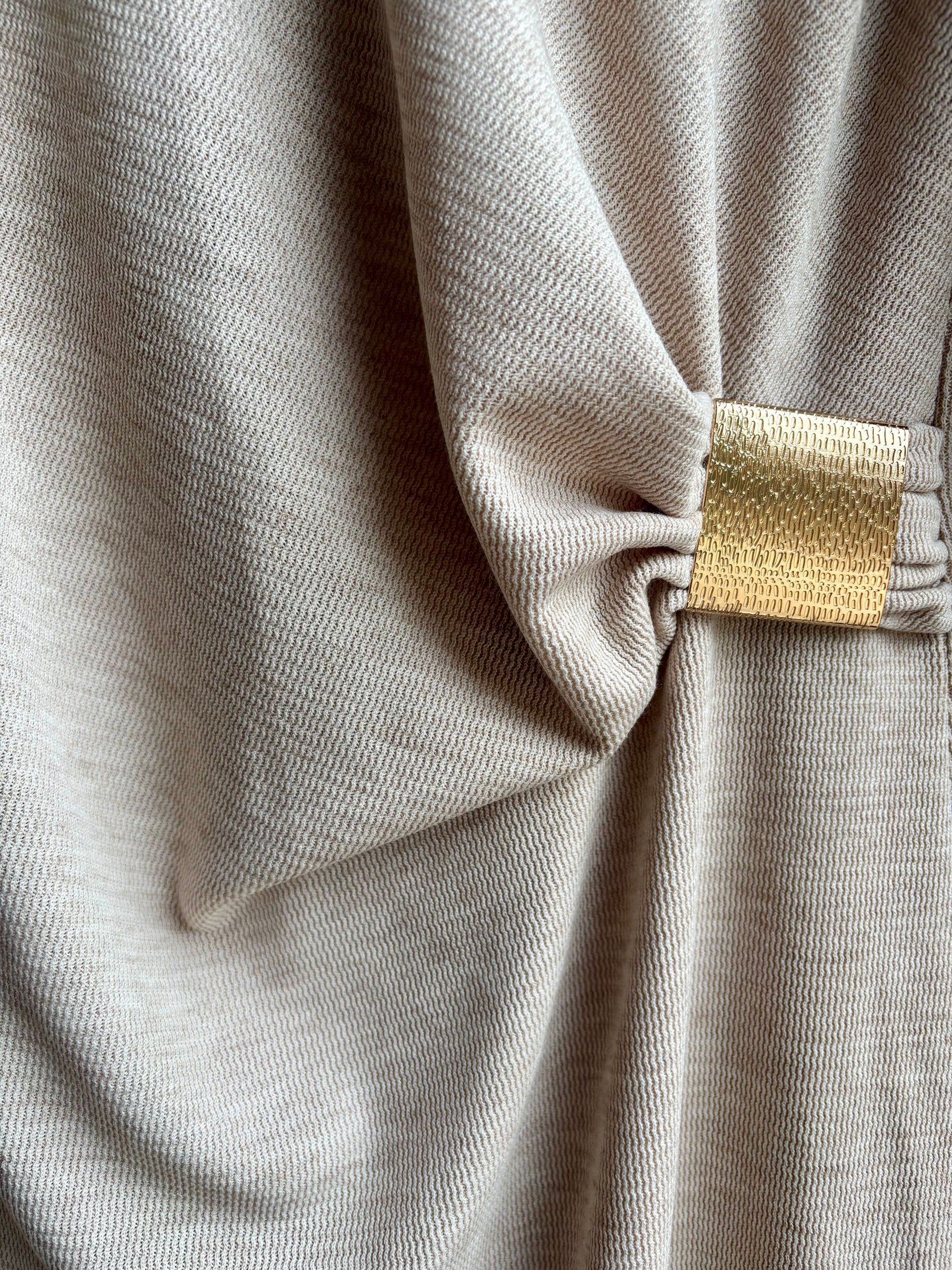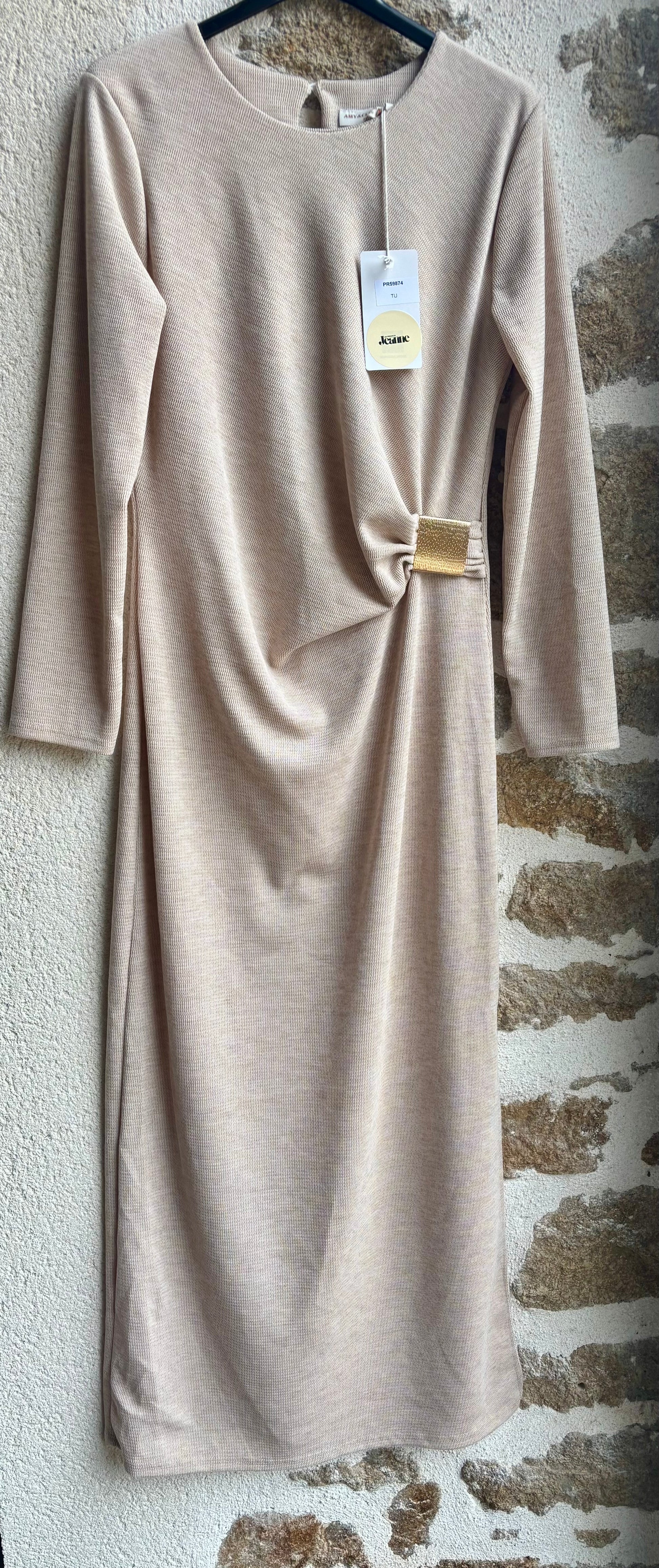 Robe longue dotée d'un effet drapé et d'une boucle dorée. Manches longues et col rond. Elle allie confort et style pour un look raffiné en toute occasion.