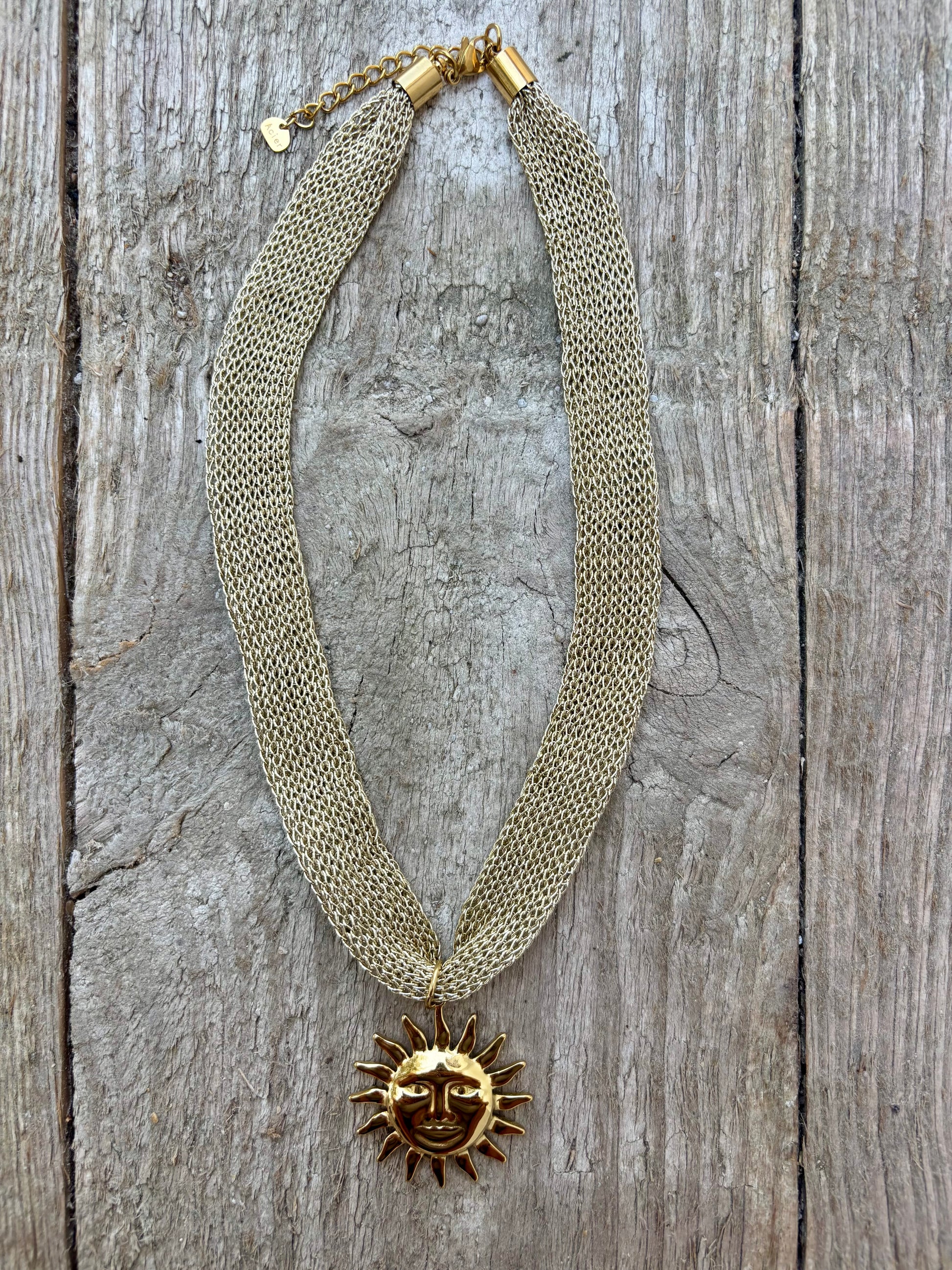 Illuminez vos tenues avec Solène, un collier élégant au pendentif soleil plein doré orné d’un visage au centre, symbole de lumière et de chaleur. Le tour du collier, mi-chaîne mi-textile légèrement brillant, apporte une touche raffinée et moderne.